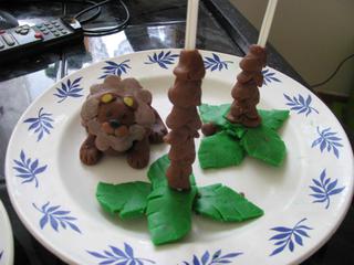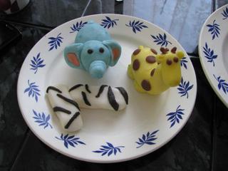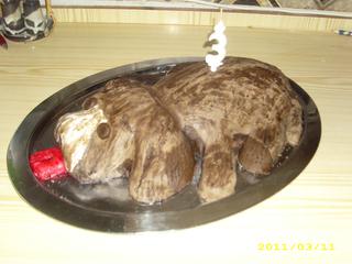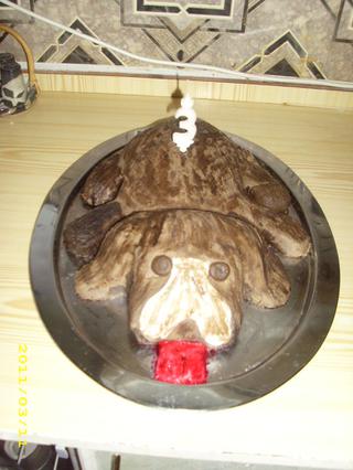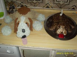 jenže jak jsem potahovku barvila,tak se mě tam dostalo asi moc vody a pak se mě šíleně trhala. začla jsem být zoufalá a fakt mě bylo do breku.ale nakonec jsem si poradila a všechno "zamaskovala". jediné co mě mrzí,že dort není stejně barevný jako plyšový pes. kvůli té potahovce jsem to musela udělat jak se dalo.ale nevadí,hlavně,že to dopadlo jak dopadlo. jsem spokojená.