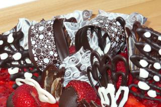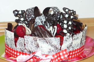 Tak mám dodělanou jahodovou mňamku, dole piškot, pak jahodový džem, jaogurtovo šlehačkový jahodový krém - s tím žetinovým ztužovačem je to spuer, už nevím, kdo mi to tu radil - tak dík ,jahody, jahodová Galaretka - kdo to nezná, tak to je ovocná želatina a na čokoládové ozdoby jsem vyzkoušela, co se dalo, i kousek té transfer folie - to jsou ty 2 puntíkaté oblouky a ty kraje jsou struktur folie