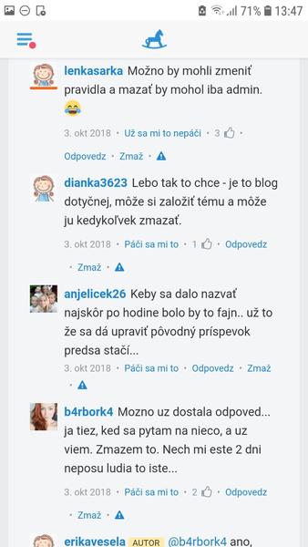 No preco asi..lebo niektore su tu prilis mudre....vedia bsetko najlepsie ,su dokonale matky manzelky dcery nevesty...a autora a jeho zivot poznaju lepsie ..nadavaju urazaju a hejtuju..nedaj boze ak niekto napise ze ma l"en" ukoncenu strednu skolu alebo nema vela financii tak su uz lenivy, hlupya ak niektora neplanovane otehotnie uz je nezodpovedna...clovek ked chce radu potrebuje si kazde slovloicko premysliet lebo min.jedna taka mudra sa najde...a kazda diskusia sa konci hadkou..takze ani sa necudujem ze sa diskusie mazu