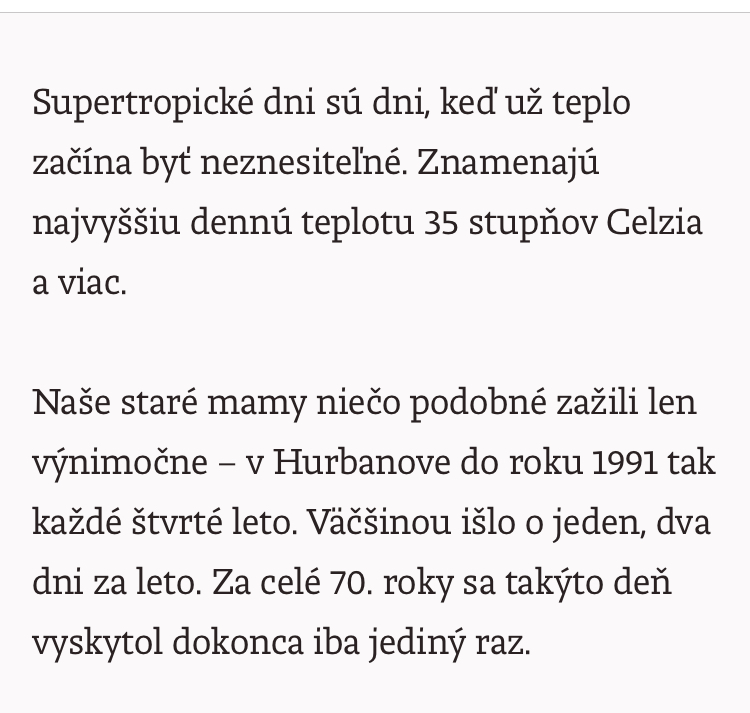 @sisaka som rada, ze to potvrdzujes, lebo mam pocit, ze mi tu skor neveria 🙂 Ano, clovek vselico zabudne, hlavne, ked bol dieta, ale mam urcite spomienky, napr. ked hlasili v TV, ze v BA bude dalsi den velka horucava a na obrazovke bolo slniecko a 28 stupnov 😂 a podobne. Som si ista, ze meteorologicke zaznamy by to potvrdili. Zaujimave vsak je, ze moje spomienky na detstvo v lete v BA aj u babky su zaliate slnkom, spominam si, ze sme pobehovali v sortkach, na sidlisku pustali z jednej na to usposobenej preliezky vodu a vytvorili taky mini bazen s vodou po kolena - ta voda bola z vodovodu a samozrejme, studena..., prehradeny potok si pamatam z prazdnin u babky... a tie teploty rozhodne boli dobe zodpovedajuce. Moja mama horucavy neznasala, stale spominala Liptov, odkial pochadzala, ako to tam bolo v lete prijemne a z pobytu tam si spominam, ze som mala na sebe aj teplaky (urcite nie vzdy a stale, ale proste tato spomienka mi utkvela v pamati). Moje spomienky su urcite ovplyvnene aj tym, ze cast detstva som prezila byvalej Juhoslavii (otec tam pracoval, mama bola z toho tepla hotova) a viem, ze tam bolo teplejsie, ale v letne vecery sme ako deti mavali aj tam na sebe svetrik.