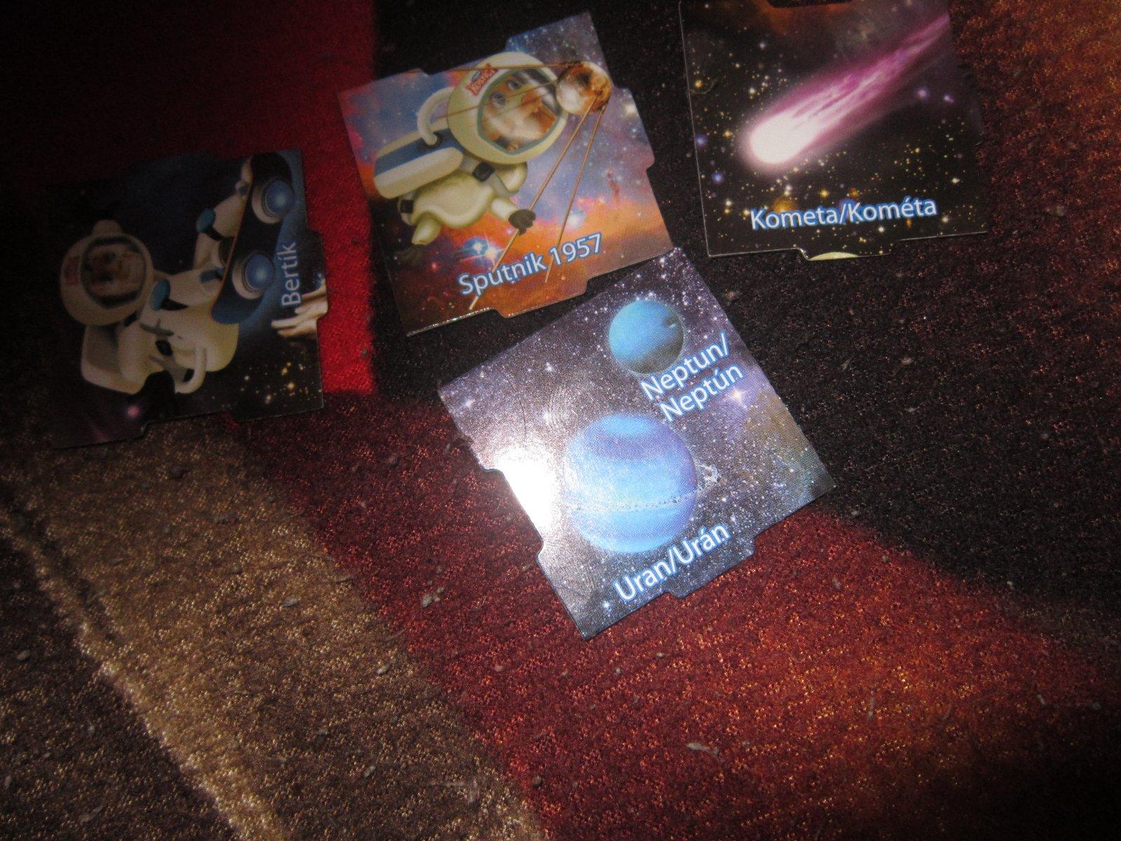 Ahojte, nam uz chyba iba 12 - cierna diera. Na vymenu ponukame: 2 (VES),3 (MÍR),6 Urán,7 Venusa,8 prvy clovek,9 slnko,10 satelit,11 Saturn,13 Sputnik,14 Zem,20 Bertik, 21 spiralova galaxia, 22 raketoplan, 23 lietajuci tanier, 28 lunarne vozidlo.