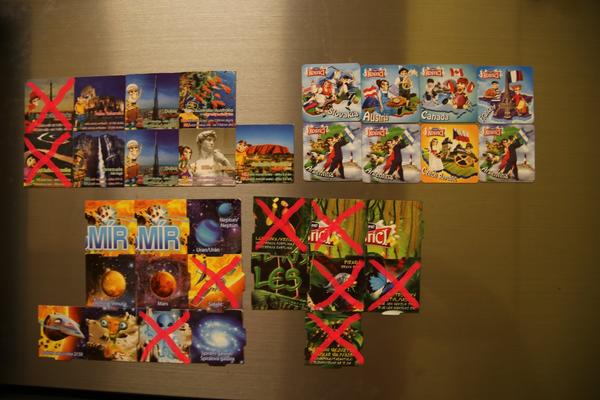 Na prvom obrazku su magnetky a 3D obrazky, ktore ponukam na vymenu alebo predaj. Na druhom obrazku su magnetky zahadneho pralesu, ktore mi este chybaju (cerveny krizik znamena, ze take uz mam)