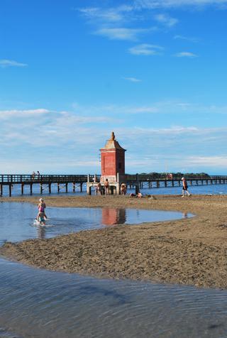 - drevene molo je perfektny rozdelovnikom na horizonte medzi pevninou a oblohou, kde v pozadi je este aj zelen.