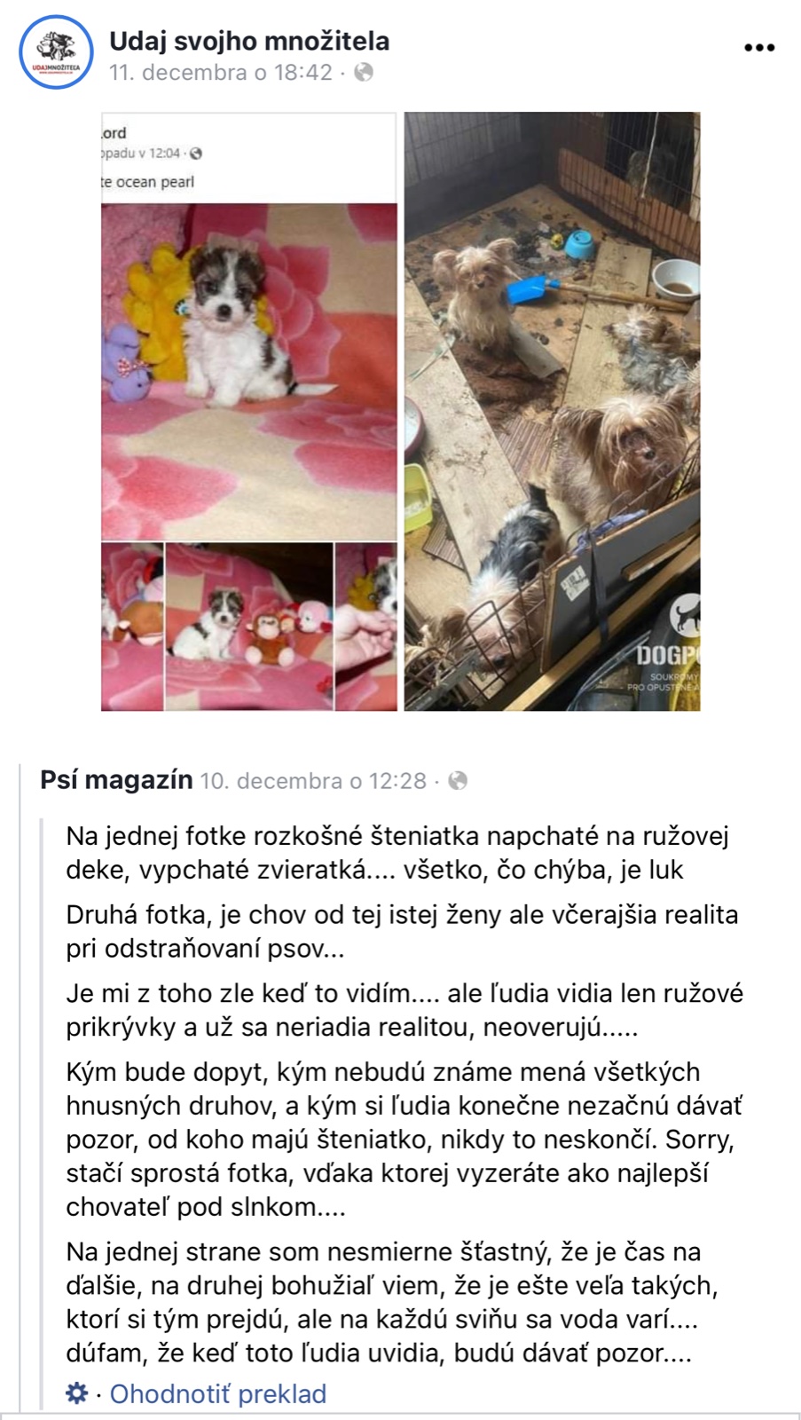 Autorka, keď si kupuješ mobil, tiež si kúpiš original, kúpu si premyslis, zaujimas sa o recenzie, vyberieš si obchod, kde poskytnú zaruku(nekúpiš ho od neandrtalca, ktorého stretnes na trhu). Teraz si ideš kúpiť zviera, ktoré budeš mat 15 rokov a pristupujes ku kúpe laxne ako keby si kupovala pečivo k nedeľným raňajkám. Nemas garanciu, že z neho bude 3 kilový yorkshire, zrejme dopadnes tak, že ti z toho vyrastie 10kilovy oriešok, akých máš plne utulky, len za nich nedas 350eur. Veľa mnozitelov má viacero vrhov, čiže si mozes doniest stena s falošným ockovanim a parvom, do zachrany psíka nalejes stovky eur a aj tak ho nezachránis. Veď na SK mame stovky takých pripadov.
