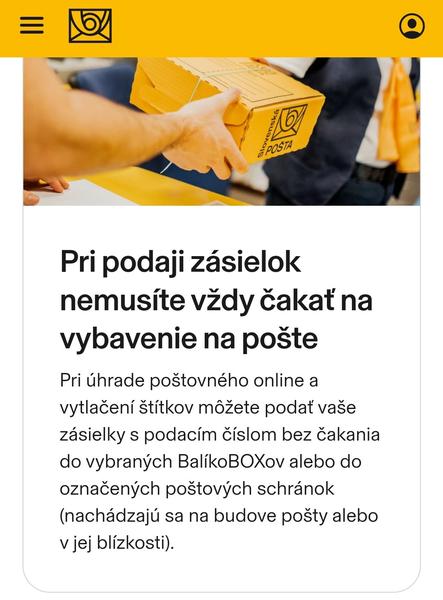 Pri úhrade poštovného online a vytlačení štítkov môžete podať vaše zásielky s podacím číslom bez čakania do vybraných BalíkoBOXov alebo do označených poštových schránok (nachádzajú sa na budove pošty alebo v jej blízkosti).