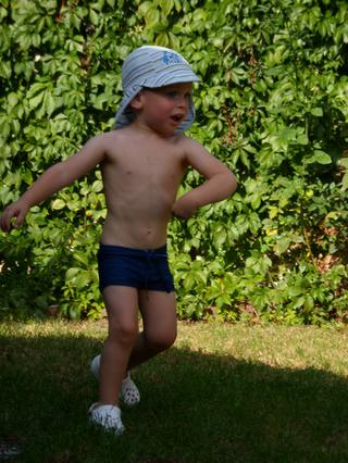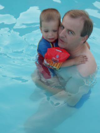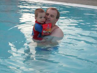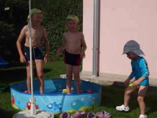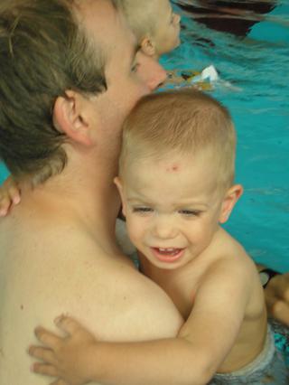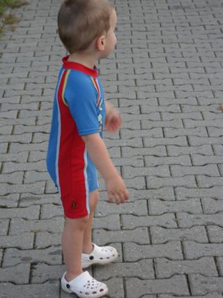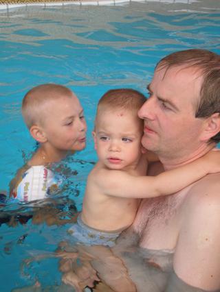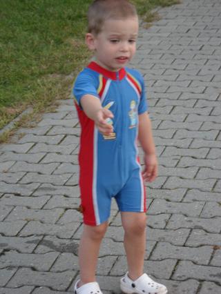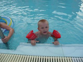 čiže napokon strach prevážil nad radosťou a fascináciou... ale po každé, keď chalani vybehli z bazéna, tak hneď k nemu utekal (a "z brehu") sa v ňom člapkal... a to isté bolo aj včera pri tom veľkom bazéne... (a vlastne asi aj všade, kde sa na niečo veľmi teší a súčasne sa aj bojí)...
