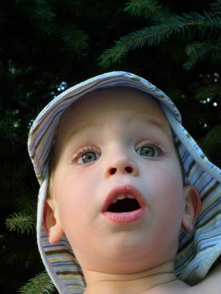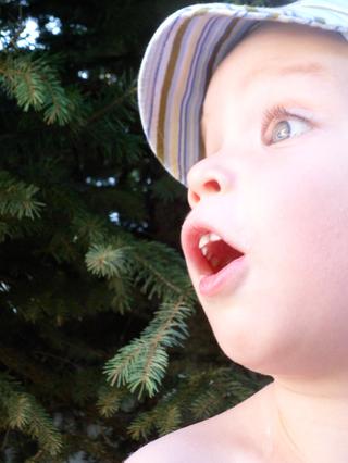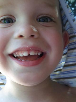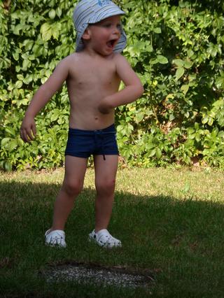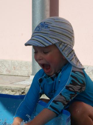 aj na tých fotkách je to markantné-čo sa kúpali prvýkrát na dvore (v tom plavkovom tričku je tam, takom sýtotyrkysovom), má tam tak doširoka otvorené ústa...