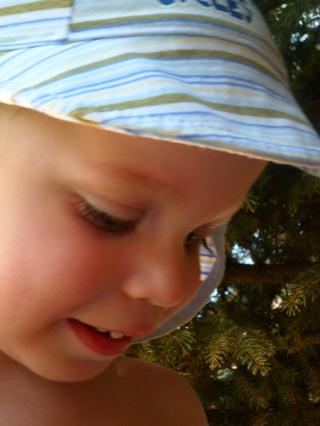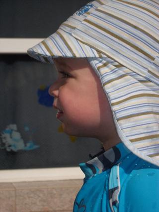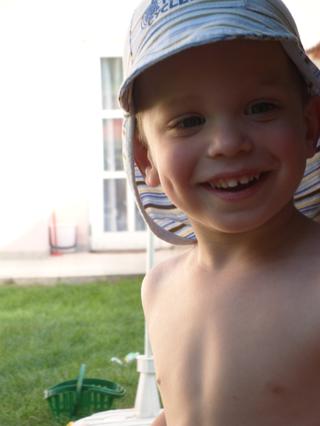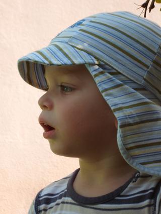 a tá čiapka? to má takú "čiapku-legionárku", ktorá chráni nielen hlavu, ale aj uši a krk (keďže on sa nechce dať natrieť krémom proti opáleniu)... je tenučká a super pod ňu podfukuje, keď povieva vánok, tak sa mu hlava aj chladí a ona vlastne uši a krk len prekryje, nie prikryje 😉
