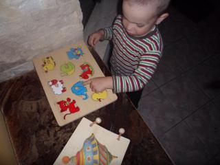 @valika_val na puzzle je este veeelmi malicky 🙂 Ja som pochopila,ze si pisala o vkladackach 😉 Puzzle-dvojdielne,drevene - nespoji ani moj,hoci by uz mohol.On da k sebe tie,co k sebe patria,ale nema taku jemnu motoriku,aby ten jeden diel mierne nadvihol a vsunul ich do seba.To mu musim vydatne pomoct.