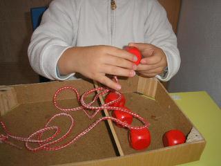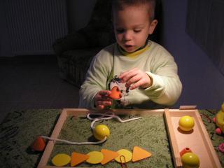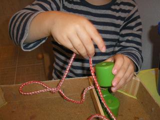a sa už pekne zdokonalil v triafaní do dierky, ale som mu to uľahčila tým, že som do šnúrky navliekla špáradlo, aby mal ten koniec pevný ako ihlu 😉