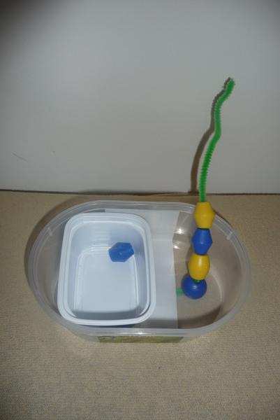 navliekanie koralkov na taky ohybny "ochlpeny" drotik - mala miska je k velkej pripevnena samolepiacim suchym zipsom aby sa nehybala, drotik je upevneny tak, ze noznicami som spravila dieru do velkej misky a odspodu som ho zalepila lepiacou paskou, vrch drotika je trosku ohnuty, aby bol pevnejsi a gulatejsi na lahsie navliekanie