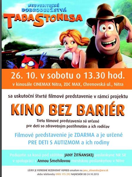 ahojte mamicky,chcela by som vas aj s vasimi detickami pozvat na stvrte predstavenie Kina bez barier. Tentokrat bude v Nitre - viac info v letaku,ktory prikladam . Predstavenie je pre autisticke deticky s rodinami ale pridat sa mozu aj deticky s inym postihnutim,aj zdrave. Premietanie je prisposobene specialnym potrebam. V pripade zaujmu,prosim, prihlasit na uvedene telefonne cislo alebo email.