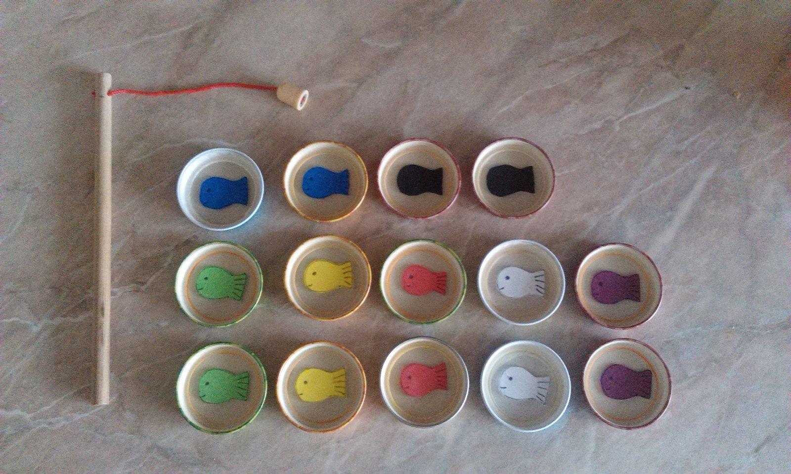 @minulin A tot dnesna nova nasa aktivita (mame drevenu hru, ze chyta rybicky s udicou (na nej je magnet). Uz davnejsie sa s nou nehral a dnes som spravila zmenu - machove rybky som nakreslila, nalepila do vrchnakov od vyziv a funguje 🙂. Ja mu vravim, ze ktoru farbu na chytit na udicu a on jednou rukou (tu druhu rucku mu sem tam musim pridrzat, lebo by to mal az prilis potom jednoduche) udicou chyti.