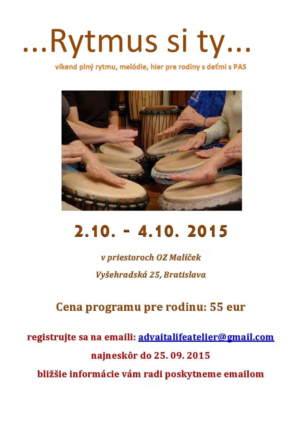 Vikend plny bubnovacky a muzikoteraputickych hier pre rodiny deti s PAS. Objavte v sebe rytmus a melodiu, ktora je ukryta hlboko vo vas. Zakladne info na plagatiku v prilohe.