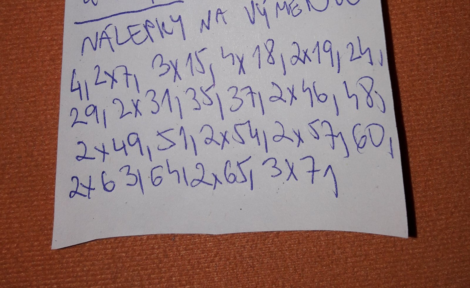 Nálepky čísla: 1, 3 (2x), 6, 8(2x), 9, 10 (2x), 13, 16 (2x), 20, 21, 23 (2x), 24 (2x), 25, 30, 31, 32, 33, 35, 36 (2x), 38, 40 (2x), 42, 44, 48 (2x), 50, 54, 58 (5x), 59 (2x), 61, 63 (2x), 64, 67 (2x), 68, 70