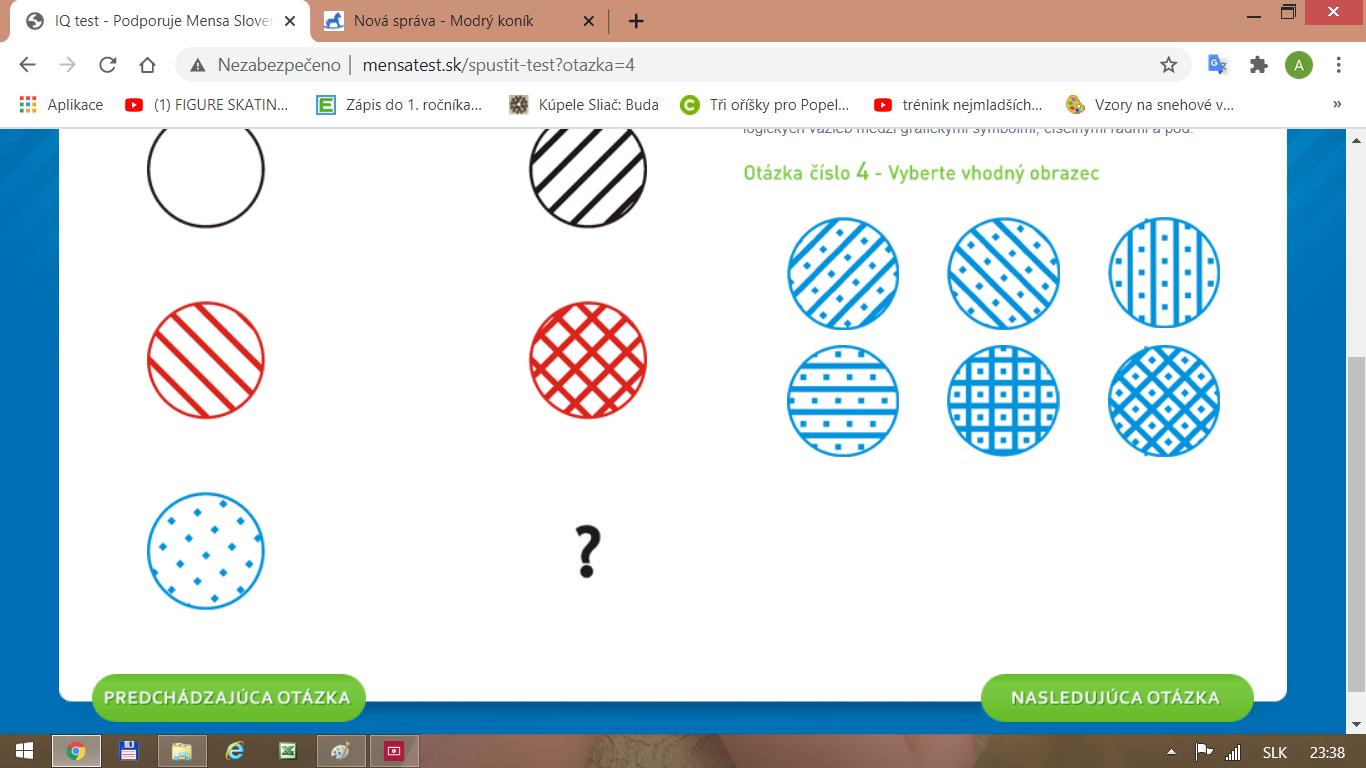 @darja12 podľa mna ešte niečo budeme mat zle keďže nevyšlo 160. možno tu otázku na ktorú si sa pýtala povodne, čo som povedala že je štvorec s 2 štvorkami. Možno ten systém čo som našla ja nie je správny (ale podľa mna by mal byt správny každý systém ktorý sedí a ten sedí). Môj priateľ tam dal tuším so štvorcom a kvetinkou lebo tam našiel iný systém a že v každom riadku sú 3 znaky v tých útvaroch tak že podľa neho ma byt aj v treťom- mne sa tato odpoved nepáči, ale nemôžem povedať že je zlá. Proste niečo je tam aj tak zle ale on dal Len tuto odpoved inú.