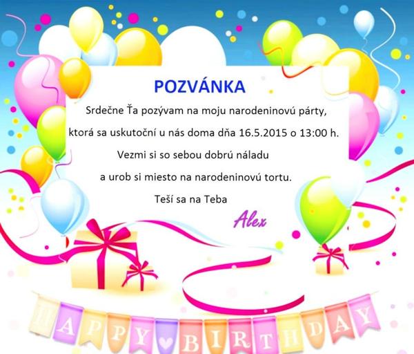 ahoj, my máme zatiaľ pozvánku takú, že je tam jeho fotka, nejaké balóniky a text: Hurá, konečne budem mať tie narodeniny. ešte tam možeš pripísať - prídite ich osláviť spolu so mnou vtedy a vtedy, tam a tam.