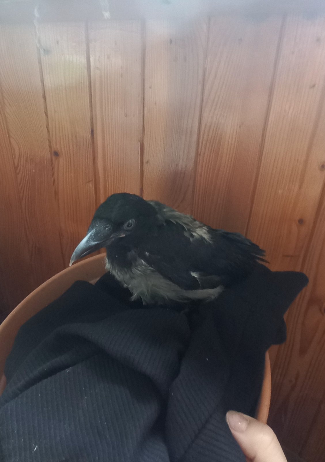 Ináč, hento je už "veľká" vrana. Mladá, ale oni vyliezajú z hniezda keď ešte nie sú úplne letuschopné a rodič ich kŕmi. Ako.... mala by byť vonku....