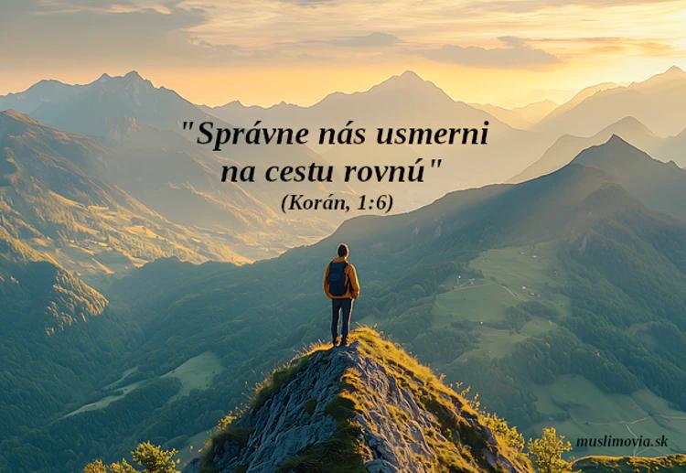 "Správne nás usmerni na cestu rovnú. Na cestu tých, ktorým si dary Svoje podaroval, nie tých, na ktorých je hnev zoslaný, ani tých, ktorí zblúdili." (Korán 1:6-7)