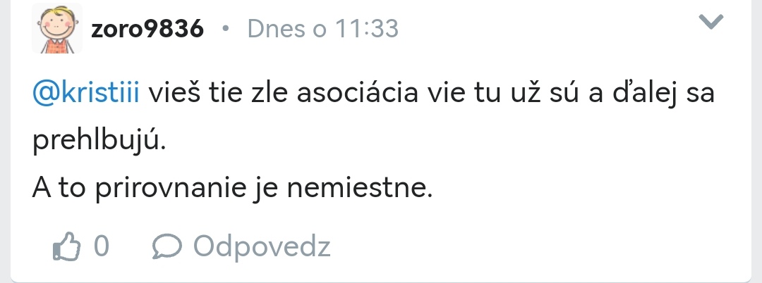 @zoro9836 keď si spomenul prirovnanie s politikou, vieš na ktorého politika som si pri tvojom konaní hneď spomenula? Na toho cvoka, ktorého syn zavraždil dvoch nevinných ľudí. Ten chvíľu po čine pomazal väčšinu svojich nenávistných statusov na svojom profile. A nie nechcem tým povedať, že ty si tu písal podobné statusy, ale vážne ty tu chceš niekoho poúčať a ešte do toho miesat politiku? Dávaj si pozor na to čo píšeš a čo robíš, v ľuďoch to môže vzbudiť aj taketo veľmi zlé asociácie.