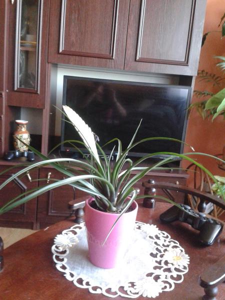 @mirkaavincko No ale to sa oddelit neda,lebo ona vyrastla tak zvlastne z boku,nie na stonke ako u tychto rastliniek byva zvykom... Takze keby som ich oddelila poskodim jednu aj druhu. Toto je fotka,ked bola este malicka,uz je podstatne vacssia ma aj korienky aj viac listkov,ale je stale prichytena o bok materskej rastliny...