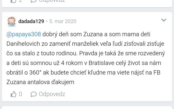 Tu v roku 2020 písala na MK. Vilo z Modrého z neba sa aj raz vyjadril, že tá pomoc bola zbytočná od nich a od ľudí (jej muž sa nezmenil), takže sa ani nečudujem, že nakoniec sa rozviedli.