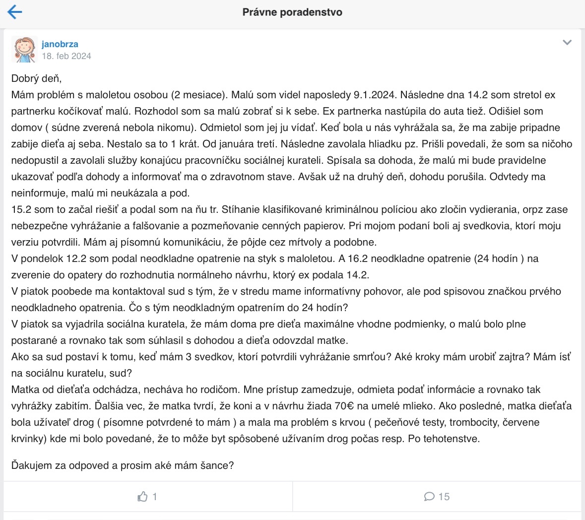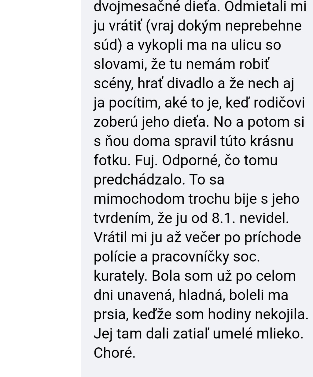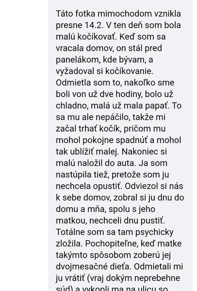 Pamatate si na jedneho chlapa, co tu pisal vela krat a hral sa na chudacika. Ze exfrajerka s nim asi caka dieta, testy dna si daval robit, a neskutocne tu ohovaral matku babatka dievcatka. Tak nasla som na fb vyjadrenie tej matky a je mi zle. Ten chlap tu zenu bil, prenasledoval, aj z domu s babatkom sa bala vyjst. A ked som citala tuto cast stale mi je zle z tej predstavy. Ked malo dievcatko mesiac pockal si ex pred bytom a nalozil babatko do auta. Ex sa samozrejme natlacila do auta k babatku. Ked dosli k nemu, ex vyvrel a zamkol byt aj so svojou matkou.