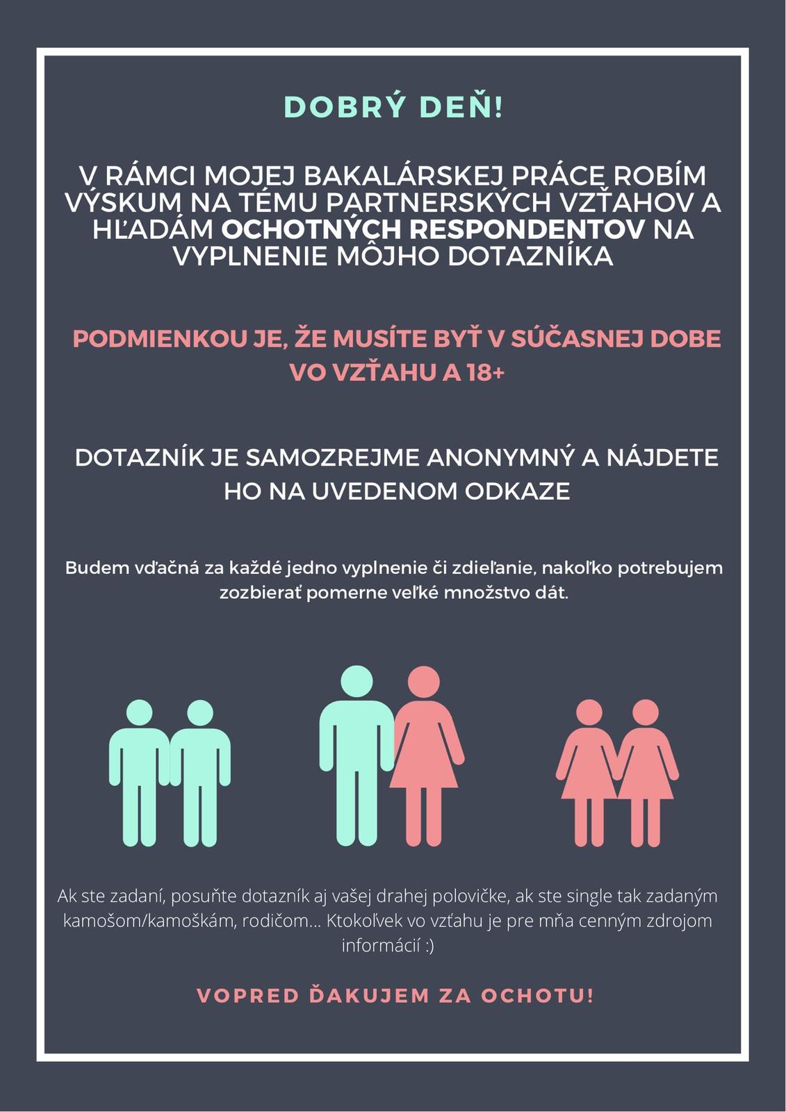 Podmienkou je vek 18+ a skutočnosť, že ste v súčasnej dobe vo vzťahu. Hľadám ako ochotné ženy, tak aj mužov, preto budem rada, ak by ste dotazník posunuli aj Vašim partnerom/partnerkám 🙂