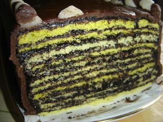 Potom nakrájame(vodorovne tri pásy a zvyslo 10, ale to je jedno a ozdobíme čokoládou.