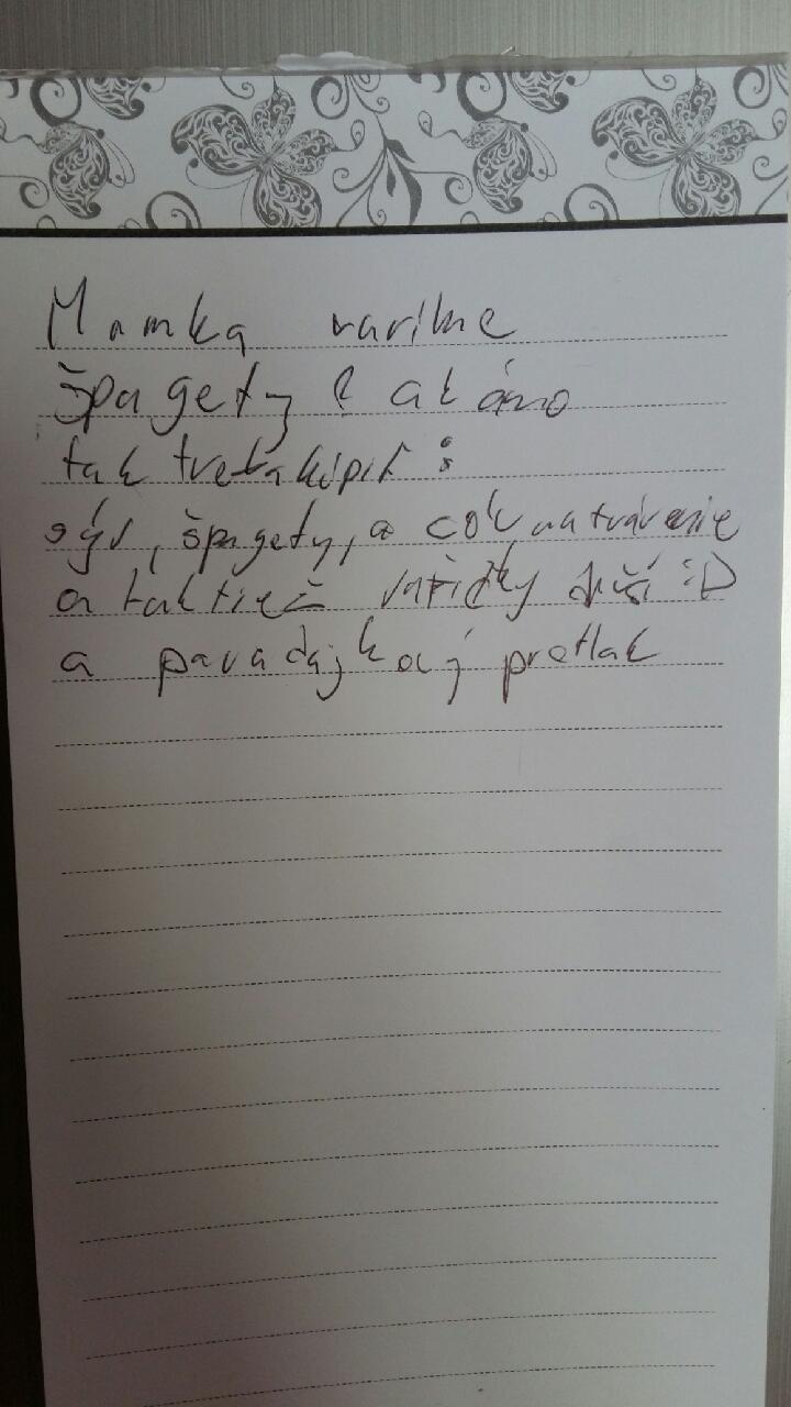 Teraz ma napadla jedna vlastna situacia z mojho detstva.Rodicia ma poslali na 3tyz.do tabora ako 7/8rocnu a ocakavali dopis. Par dni pred navratom, plni obav ako sa mam ho dostali. V nom som pisala: "S travou a s kvietkami mozeme rast, ja milujem milujem rodnu vlast". To bolo vsetko😉