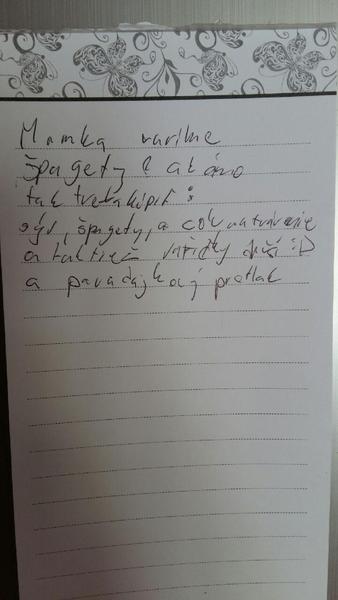 Preklad do slovenciny: mamka, varime spagety? Ak ano, tak treba kupit: syr, spagety a cosi na travenie a taktiez vaticky do usi :D a paradajkovy pretlak.