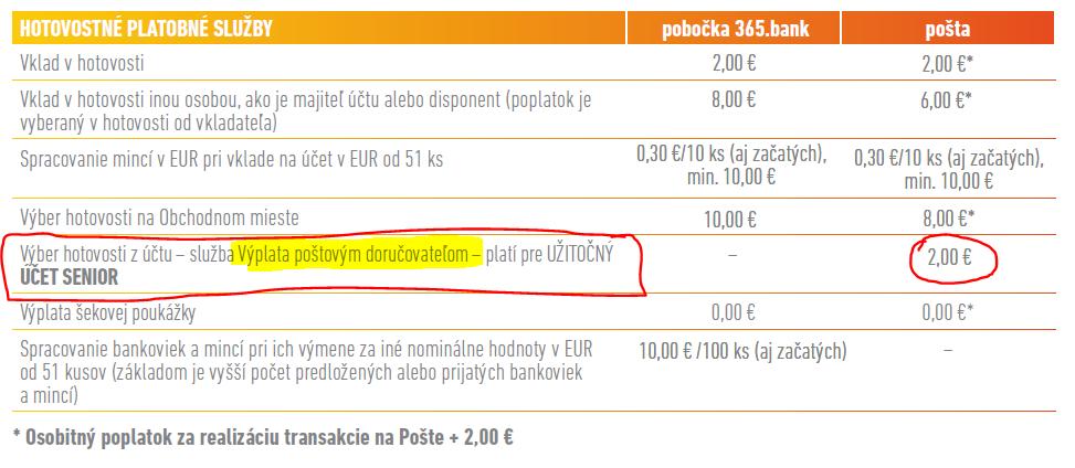 Je to táto služba volá sa "Výber hotovosti z účtu – služba Výplata poštovým doručovateľom" k poplatku za seniorský účet 2.90€ sa platí ďaľší poplatok 2€ za to že poštárka donesie vybraté peniaze z bankového účtu v poštovej banke dôchodcovi domov.
