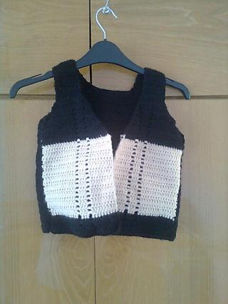 zadny diel: Zacneme na 66 ociek priadzovu vo farbe ekry a pletieme 2cm pruznym vzorom, pricom v poslednom riadku pridame jedno oko. Dalej pletieme medzi okr. ockami licovym zerzejom svetlo modrou priadzou. Po 10cm odlemu uzavieme pre prieramky po oboch stranach 1x7 ociek. Po 22cm od lemu uzavrieme pre ramenne zosikmenie po obcho stranach 1x5 ociek a v kazdej 2rade uzatvarame 2x4 ocka