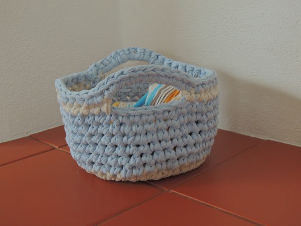 Skúsila som košíček z postrihaných detských džersejových plachiet (už nejaký mesiac ležali odložené, že ich neskôr použijem na handry a ľaľaho, ono sa to dá použiť oveľa krajšie 🙂 ) Už som vydrankala nepoužívanú plachtu aj od maminy, tak sa teším. Samotné háčkovanie už ide veľmi rýchlo, akurát to strihanie trvá...