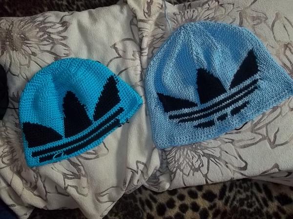 pokusy o vzor adidas, prvá čiapka háčkovaná, nedokončená, došla mi vlna a druhá pletená a dole už zladená súpravička pre synáčika 🙂