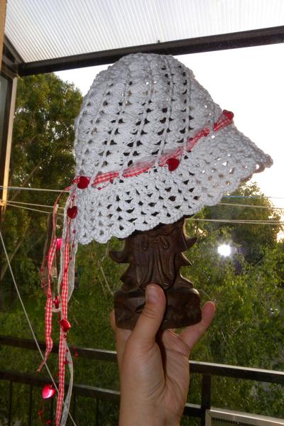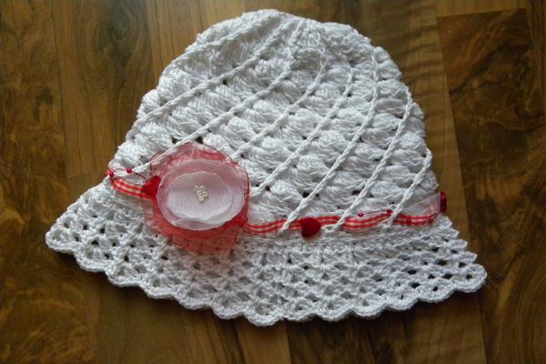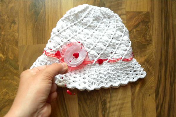 neviem ako mam dokoncit tento klobucik.co s tymi stužkami,mam ich tam nechat visiet,alebo mam tam dat ten kvet?...skusala som uviazat aj maslicku,ale nebolo to pekne...