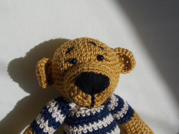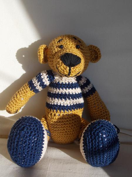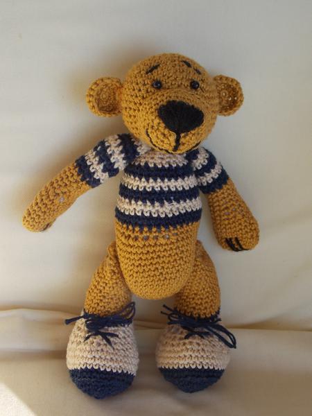 ahoj holky,často vás tu šmíruji a obdivuje jak jste strašně šikovné a tak vám dám fotky svého výtvoru.Je to první medvěd a hračka vůbec.Zatím jsem jen háčkovala čepky