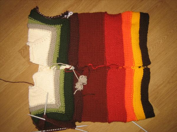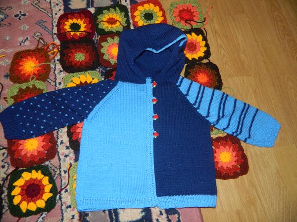 a este hackovany sveter zo stvorcov z lady luxus pre mna, aj sa mi bude chciet a bude este z coho tak dorobim kapucnu. a zopar rozrobenych veci: hnede zvysky camily na podsedak na stolcek, modre vysky na peracnik, este treba nasit zips a usit podsivku, a svetrik zo zvyskov lady luxus pre synovceka dalsieho 🙂