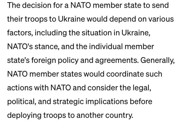 @annm81 Ja nemam strategiu ziadnu, ja ti normalne hovorim, ze v tom mas gulas tak, ako mas gulas vo vela inych veciach. Ja som ta uz raz dorazne ziadala, aby si na mna nereagovala, a ty si skratka nedokazes odpustit rypat. Tu stoji napisane, ze na implementaciu celej TREATY musia mat staty COUNCIL, ktory konanie v mene NATO odobri, navyse za takychto okolnosti, ked chces, by teoreticky krajiny NATO konali v obrane, nie v utoku. Tu sa nikto nebavi o utoku, ale o obrane Ukrajiny vojskom NATO. Nehovoriac o tom, ze Rusko davno napada aj NATO krajiny neustalymi vyhrazkami a provokaciami, a vedie hybridnu vojnu. A najdi si prosim ta nejake hobby, hovorila som ti to davnejsie, hovorim ti to teraz.