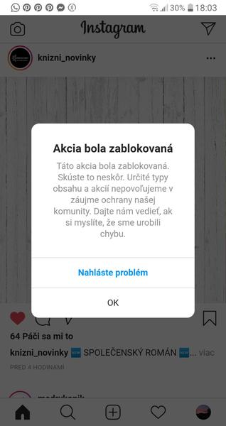 Ahojte, neviem prečo, ale asi posledné 2 dni mi nejde vôbec lajknúť fotky na Instagrame - stále mi píše, že akcia bola zablokovaná...nevie niekto, že prečo mi toto ukazuje a čo mám robiť, aby mi Instagram normálne fungoval?