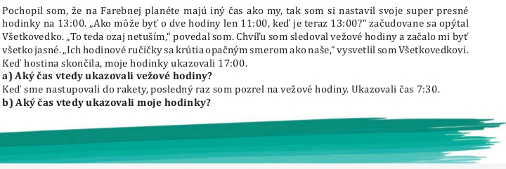 Vysledok schvalne nenapisem, ale doporucujem si zobrat klasicke hodiny, alebo si ich nakreslit a ist presne podla popisu v zadani. Toto v podstate nie je matematika, toto je cisto o pochopeni pisaneho textu. Skus si najskor premysliet, co sa stane na jeho a na vezovych hodinach o hodinu od 13:00. Jeho hodinky pojdu normalne, teda na nich bude o hodinu viac, teda 14:00, vezove idu naopak, takze tam bude o hodinu menej, teda 12:00. A takto sa pohraj.