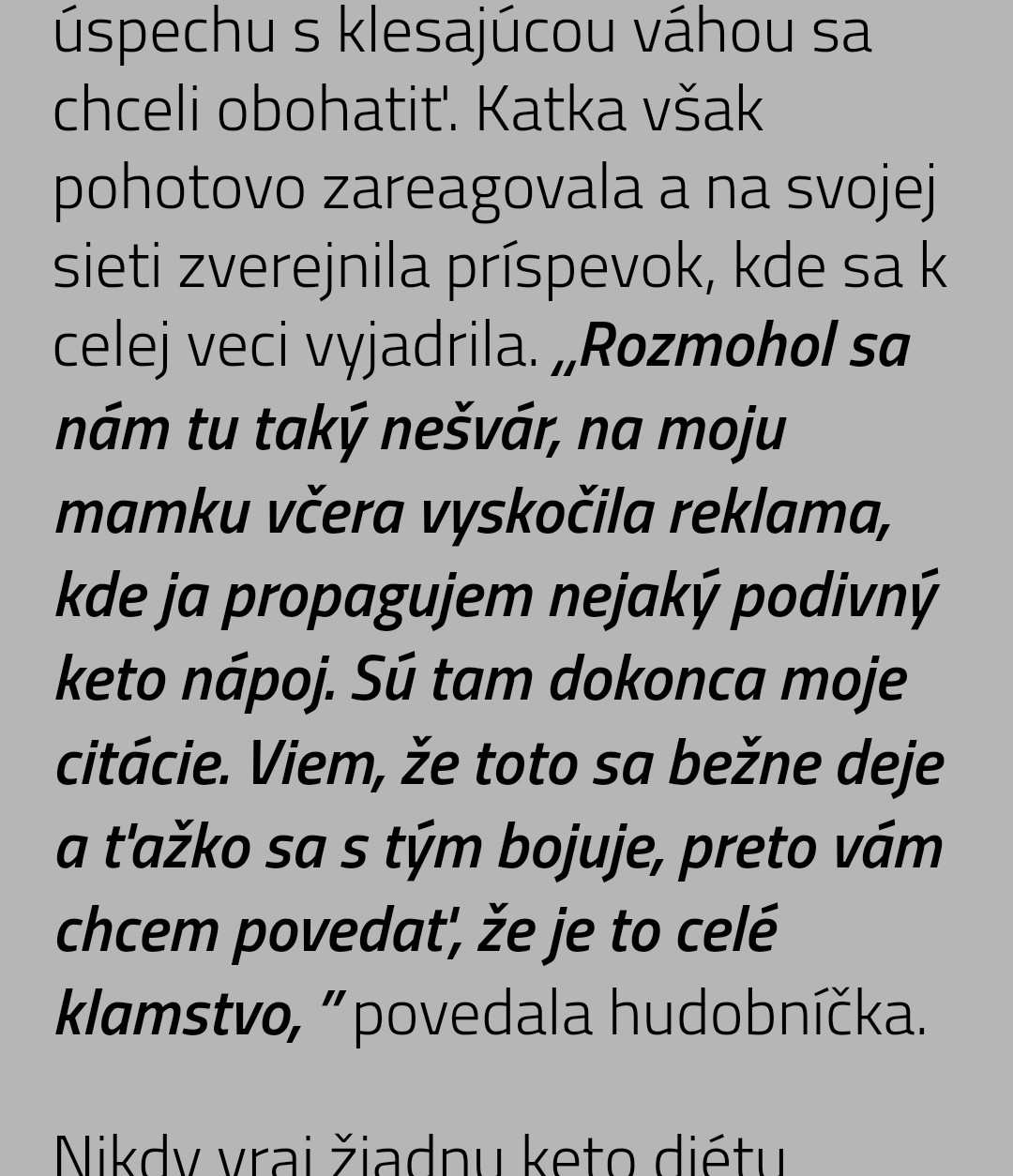 Včera som pozerala Záhady tela a súťažila tam aj Katka Koščová a teraz má takú ideálnu postavu, aj váhu, čo jej celkom pristane. Hovorila tam, že sa k takej postave dopracovala za pomoci výživovej poradkyne, ktorá jej navrhla správne potraviny, ktoré má jesť. To tiež hovorila, že to musí byť odborníčka na toto, nie nejaká s 2-mesačným kurzom.