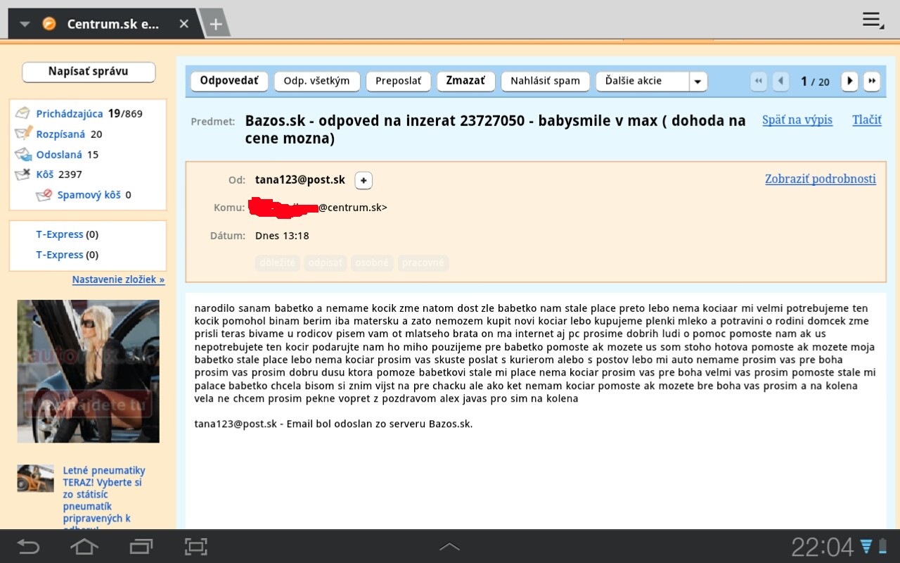 Tak dnes som aj ja dostala mail od henkelova.zaneta@atk.sk . Na bazos.sk ponukam slavnostne saty zn. Chantal, ktore som mala na svojich promociach. A tato pani by ich vraj chcela pre seba ako oblecenie na prijimanie svojej dcery! Teda to by sa tam ale blisla! Ponukam tam aj jednoduchy ale pekny kostym, ktory by som mozno aj darovala, ale ten jej zrejme nie je dost dobry! Samozrejme, ze pani nezabudla napisat, v akej je tazkej financnej situacii, ziju v kontajnerovom dome, maju zdravotne problemy a preto nemozu pracovat.... podobne ako ste pisali. Ocividne ju uz roky bavi takto zobronit a vyuzivat dovercivych ludi. Verim, ze sa najdu ludia co naletia a nedala by som ruku do ohna, ze to potom dalej nepredava.