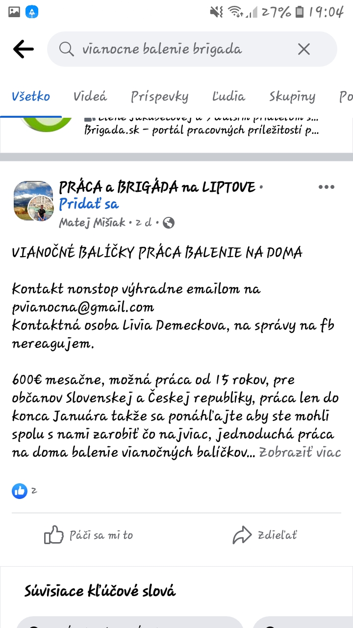 Na socialne siete pridavaju do skupin súvisiacich s hľadaním práce inzerát: ,,JEDINEČNÁ VIANOČNÁ PONUKA PRÁCE NA DOMA BALENIE BALÍČKOV NA DOHODU