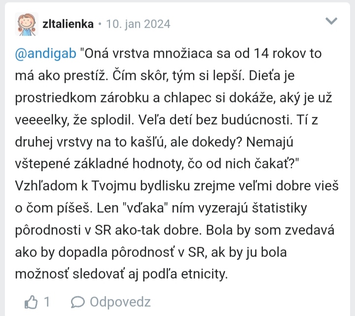 @erikavesela narážaš na tento môj starší príspevok? Ak áno, tak si ho zrejme nepochopila. Nie je dobré, že štatistiky pôrodnosti u nás vyzerajú dobre len kvôli počtu detí, ktoré sa narodia rodičom, ktorí žijú na okraji spoločnosti bez možnosti riadneho začlenenia sa do nej. (opíšem ich radšej takto). Oficiálne nie je možné spočítať koľko takých detí je (lebo diskriminácia, segregácia).