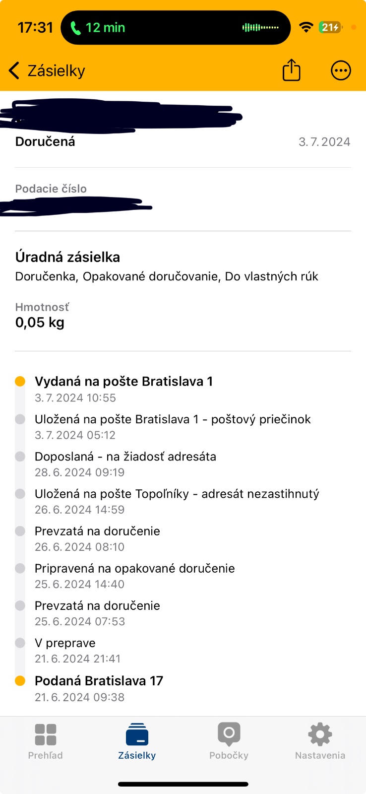 @judit47 18 kalendárnych dni som mala na vybratie ale ja napísané, že opakované doručovanie. Hneď ako sa ku mne dostala informácia, že mám v schránke žltý listok som volala na postu a hneď to preposlali. Tak nerozumiem tomu, čo to hľadalo v BA keď som to nedávala tam preposielať. Nemôže byt, že to prišlo na tu hlavnú postu a odtiaľ to dali poslať do tej obce kam som to chcela dať? A dali napr iné cislo sledovacie?