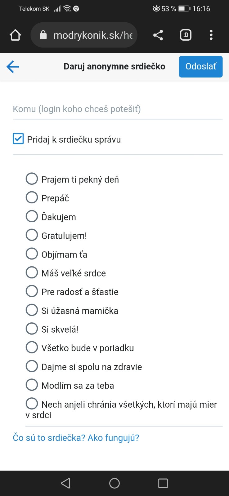 @monuska112 ja nepíšem o modliacom smajlovi, ja píšem o modliacom srdiečku a to ja nepoužívam, nikdy som ho nepoužila ani nepoužijem, ale dostávam ich. A ako sa mam ozvať, keď sú anonymne? Ja môžem len hádať, kto ich poslal, a vôbec to nemusí byť nikto s kým mam rozpor názorov, môže to byť niekto, kto len číta diskusiu a keďže dislike sa nedá na MK použiť využije túto formu aby mi dal na javo svoj názor. Tak nejak pokrytecky aby sa vyhol konfrontácii.