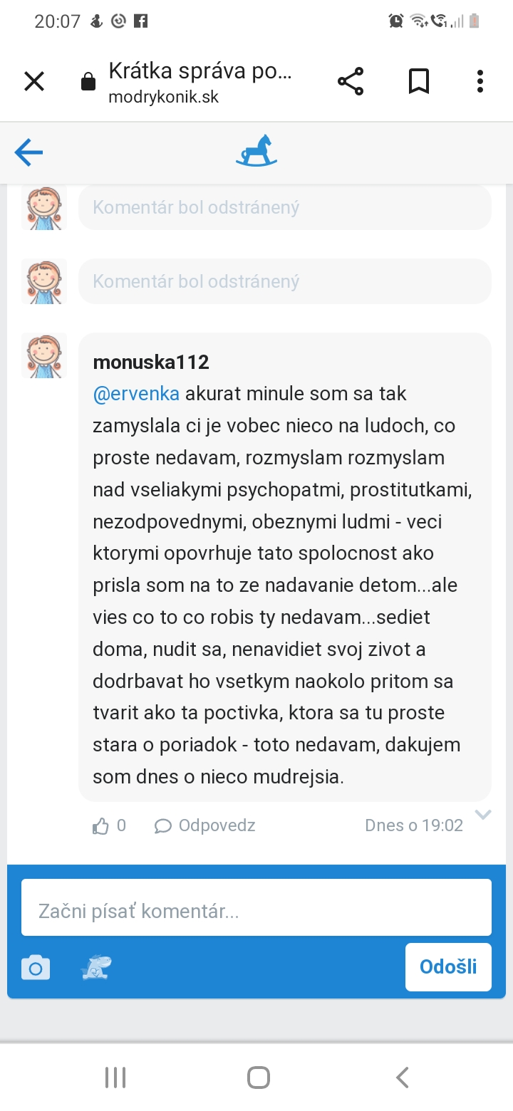 Osobne mi to nevadí. Keď som mala prvé dieťa pred xy rokmi, kamoška mi ukázala modrého koníka ako super miesto, kde lacno nakúpim oblečko z druhej ruky a kde sú baby, ktoré prechádzajú tými istými fázami tehu a majú si o čom pokecať. Teraz to už nepotrebujem. Ale aj sa to tu zmenilo, aj je to tu skôr ako freestyle, proste sa prídem zabaviť nad komentármi. Nemusím nikoho urážať, ale aj keď sa občas snažím úprimne poradiť, beriem to tak, že na 99% ide o vymyslenú tému na zábavu pre niekoho. Väčšina ľudí, čo má problém, ho nepíše na MK, ani inde na web. Ale človek nikdy nevie.