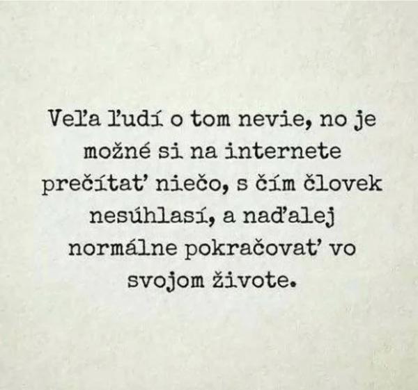 @vroni s ludmi je to zaujimave v tom,ze kazdy z nas je iny a snazim sa to respektovat aj ked je to velakrat velmi tazke,ale uplne Ta chapem co si chcela tym príspevkom napisat.Mas svoj nazor na veci a nie si strhnuta davom.Si silna zena a odolna voci psychickej manipulacii.To je vynikajuca vybava do zivota,bodaj by som aj ja taka bola.