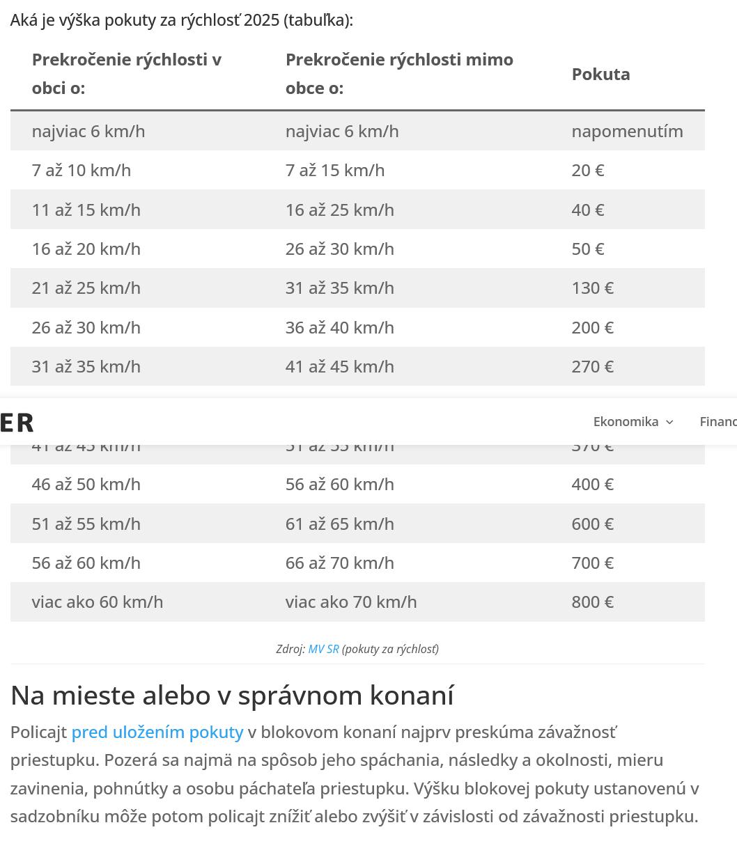 Prekročenie rýchlosti o 25 km/h - pokuta